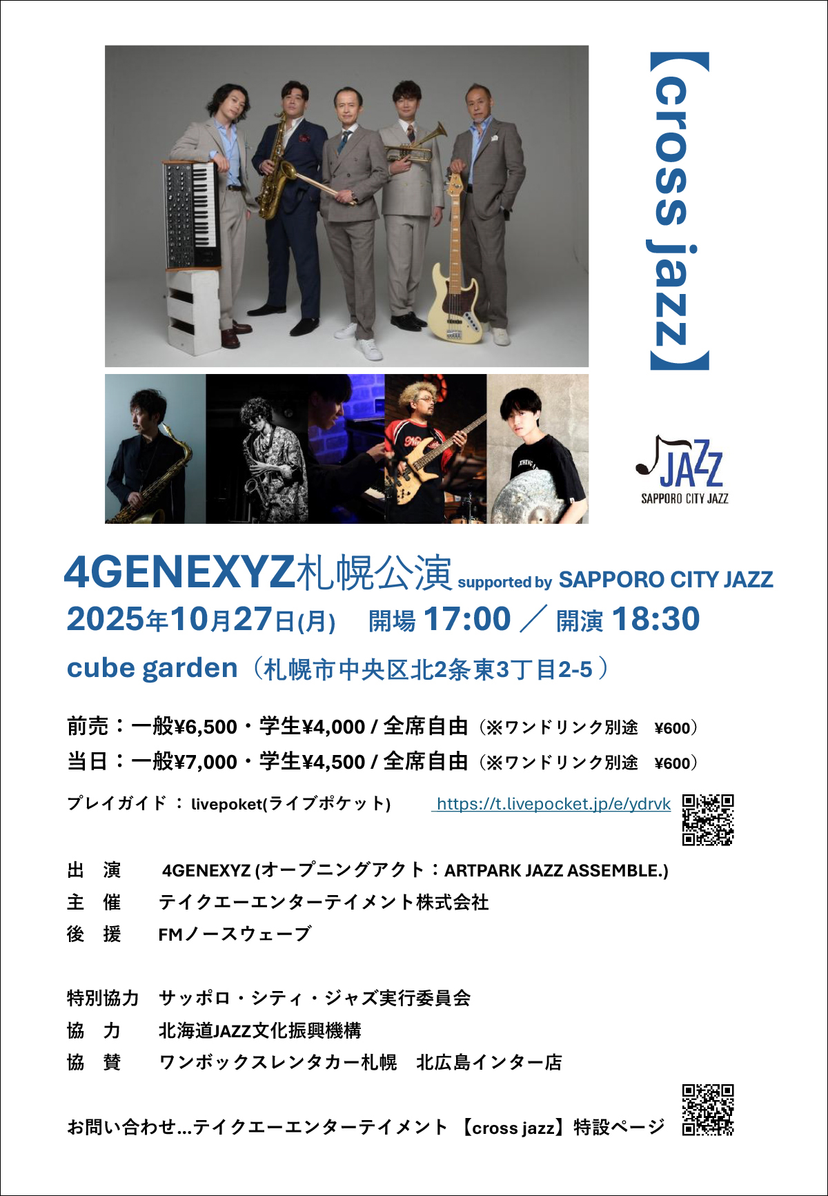 ジャズ・フュージョン界で活躍中の4世代に渡るミュージシャンが集結する 4GENEXYZ。10月27日に札幌公演をcube gardenにて開催。この度のイベント「cross jazz」は、北海道を舞台に若手・地元JAZZ系ミュージシャンが、メジャーシーンで活動するアーティストと共演することで、北海道のJAZZ系文化を広く振興し、次代のミュージシャンを育成する相乗効果を狙うというもの。