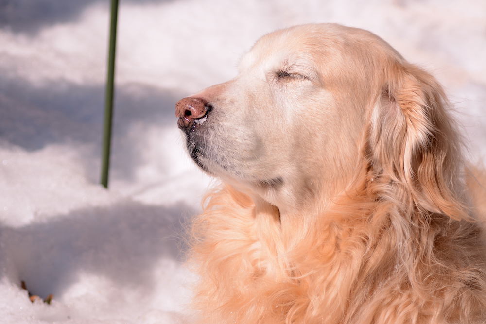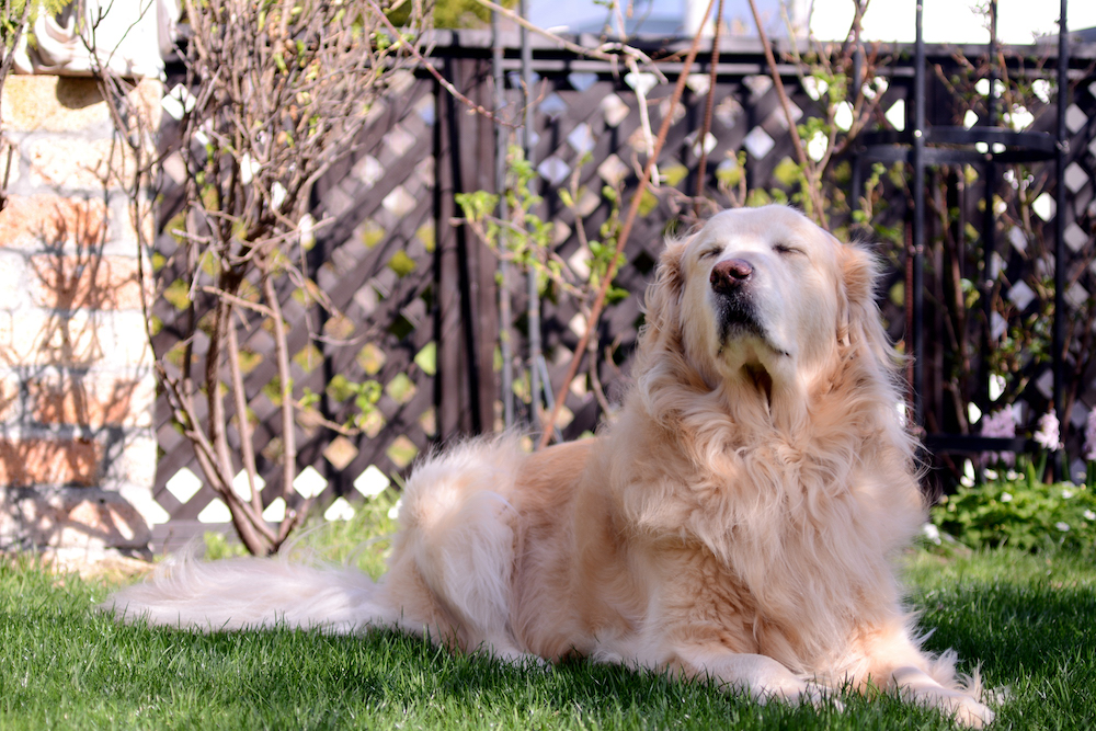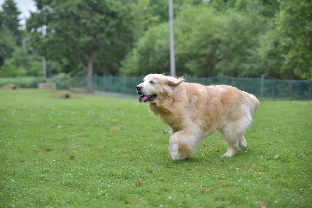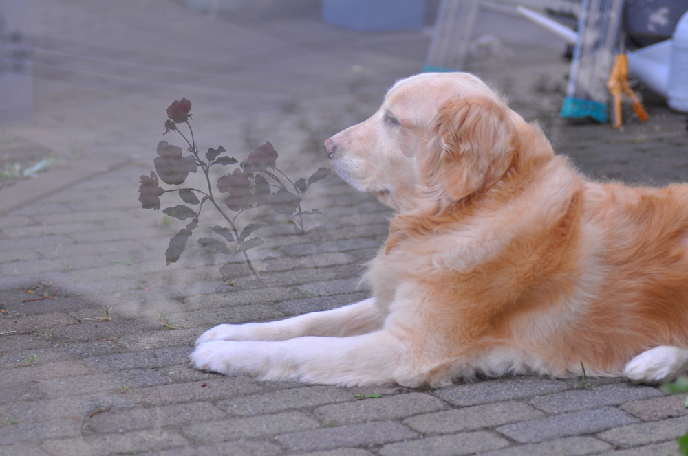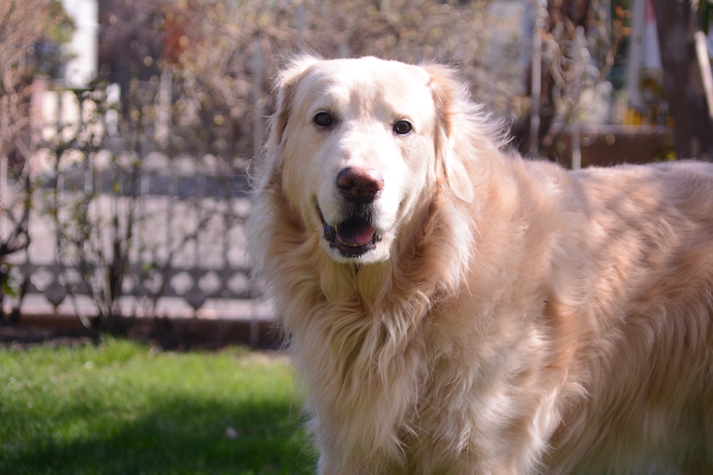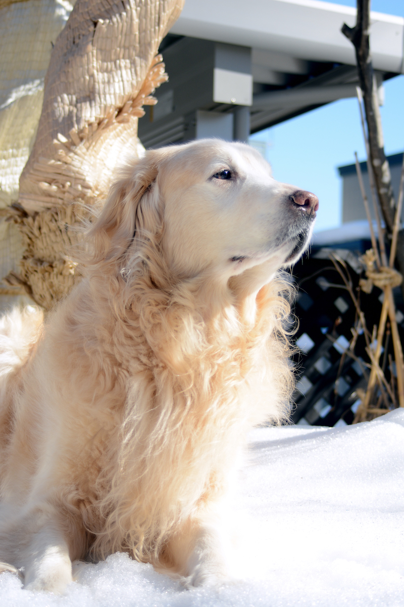 ゴールデンレトリバーで、名前は『アルバ』。家に来たときは真っ白だったので、ラテン語の白を意味するこの名が付けられた。この写真館の14回目でも取り上げた子だ。